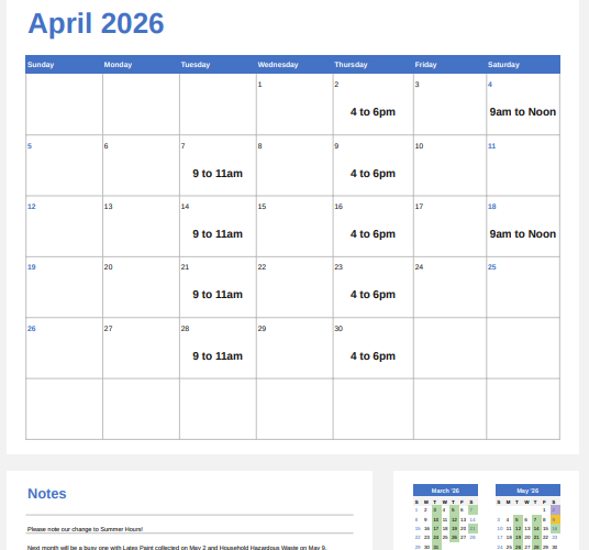 Saturday May 9 and October 24, 2026, Household Hazardous Products ONLY from 9am to 1pm. *** The rest of the...